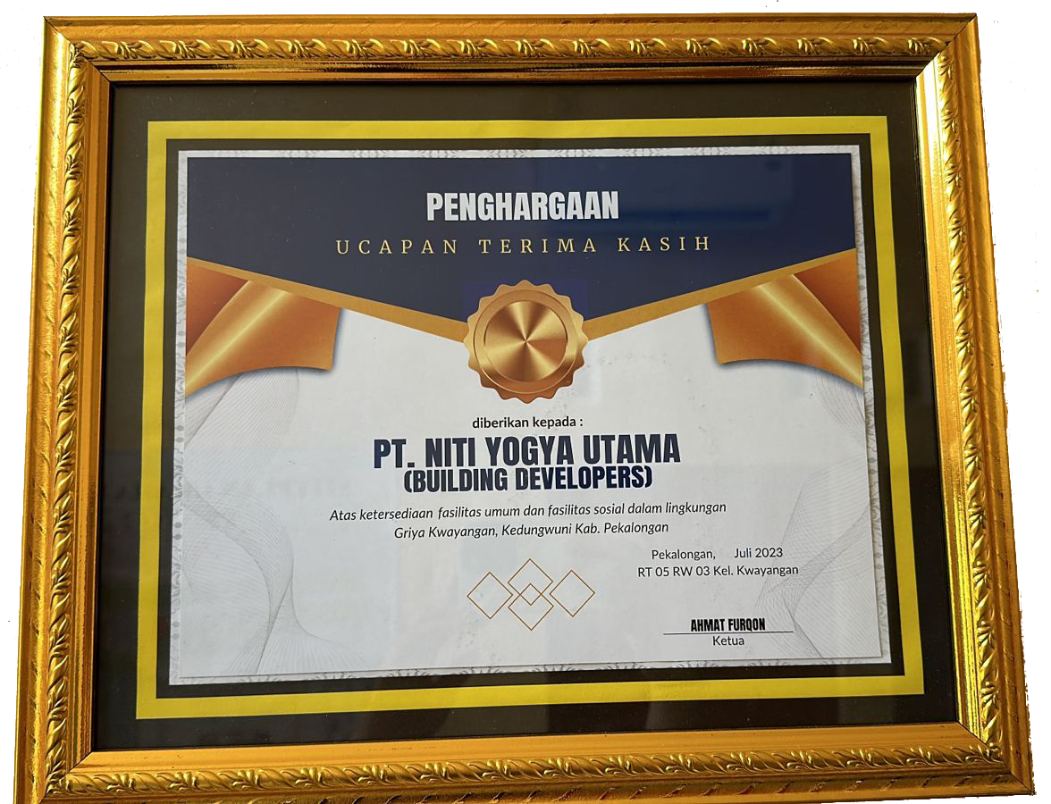 Mendapatkan penghargaan ucapan terima kasih dari warga atas ketersediaan fasilitas umum dan fasilitas sosial dalam lingkungan Griya Kwayangan, Kedungwuni, Kabupaten Pekalongan.
